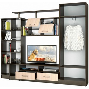 Гостиная оснащена: двухдверным шкафом, однодверным шкафом, шкафом для посуды, ТВ-тумбой, открытыми и двумя закрытыми полками.