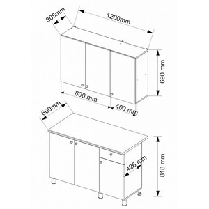Дополнительные параметры: высота верхних тумб - 690 (мм) глубина верхних тумб - 305 (мм) высота нижних тумб - 818 (мм) глубина нижних тумб - 426 (мм) толщина столешницы - 28 (мм) глубина столешницы - 600 (мм).