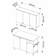 Дополнительные параметры: высота верхних тумб - 690 (мм) глубина верхних тумб - 305 (мм) высота нижних тумб - 818 (мм) глубина нижних тумб - 426 (мм) толщина столешницы - 28 (мм) глубина столешницы - 600 (мм).