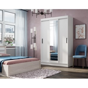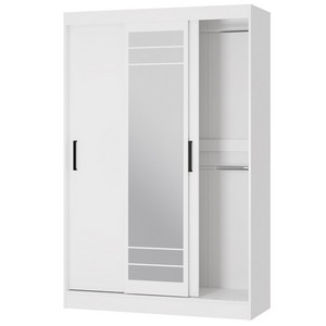 Шкаф-купе Тео ШКК-02 в белом цвете оборудован удобными дверьми с ручками, центральная створка выполнена в виде зеркала с еврокромкой. Внутри шкафа предусмотрены полки для одежды, аксессуаров и других предметов. Дополнительно в шкафу расположены две хромированные штанги для одежды.
