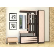 Модуль состоит из тумбы, вешалки для верхней одежды, полки для головных уборов, стеллажа и зеркала.