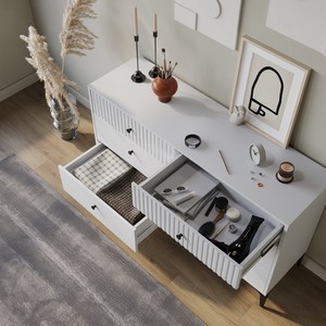 Комод MOON КМ-3.1 оснащен шестью вместительными выдвижными ящиками, что обеспечивает удобное разделение пространства для хранения различных категорий вещей.