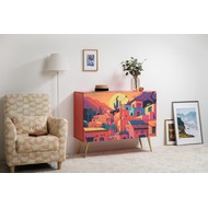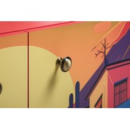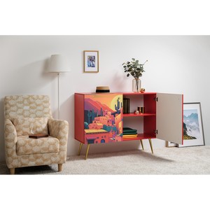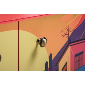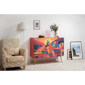 Фасады комода украшены живописным городским пейзажем, создающим атмосферу уюта и индивидуальности.