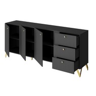 Комод объединяет три выдвижных ящика и три распашные дверцы, за которыми скрывается удобное внутреннее пространство с полками.