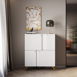 Комод объединяет четыре распашные дверцы, за которыми скрывается удобное внутреннее пространство с полками.
