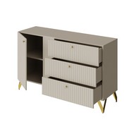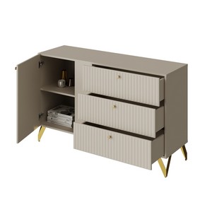 Комод объединяет три выдвижных ящика и одну распашную дверцу, за которой скрывается удобное внутреннее пространство с полками.