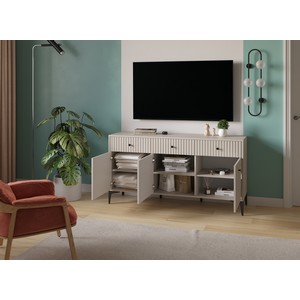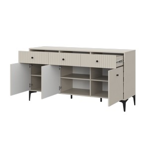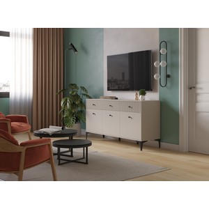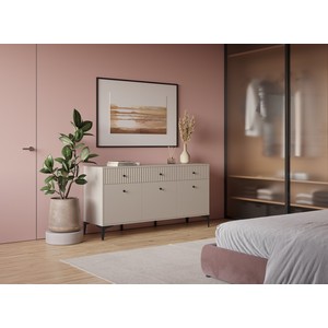 Комод MOON КМ-2.1 оснащен тремя вместительными выдвижными ящиками и тремя распашными дверцами, что обеспечивает удобное разделение пространства для хранения различных категорий вещей.