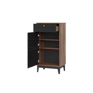 Две элегантные распашные дверцы скрывают просторное внутреннее пространство c полками и один выдвижной ящик с механизмом полного выдвижения.