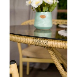 Стол со стеклянной столешницей визуально облегчает композицию и позволяет любоваться красивым плетением основания.