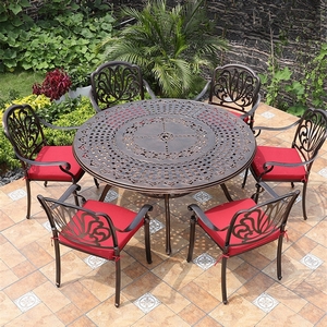Комплект мебели из литого алюминия состоит из круглого стола и шести кресел с подлокотниками.