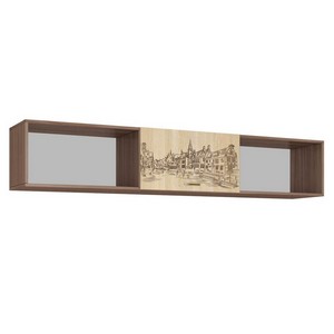 Навесная горизонтальная полка с двумя открытыми нишами и закрытой секцией с дверцей.