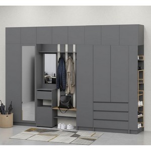 Комплект позволяет организовать раздельное хранение одежды, обуви, сумок и сезонных аксессуаров, создавая законченную и упорядоченную композицию благодаря угловому решению и модульности.