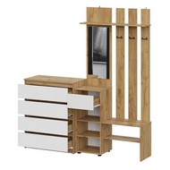 Включает вешалку с зеркалом и комод с четырьямя ящиками .