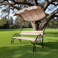 Деревянная скамейка с металлическим каркасом и тентом - идеальное решение для создания комфортной зоны отдыха на дачном участке или в саду.