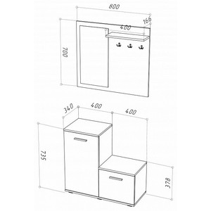 Компоненты, входящие в комплект: 1 вешалка настенная - 800x166x700 (мм), 1 тумбочка - 400x340x378 (мм), 1 тумбочка - 400x340x735 (мм).