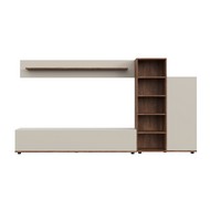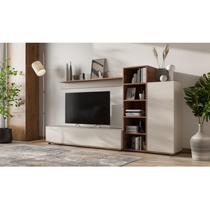 Закрытый небольшой шкаф сохраняет атмосферу безупречного порядка и телевизионная тумба с тремя просторными отсеками для хранения.