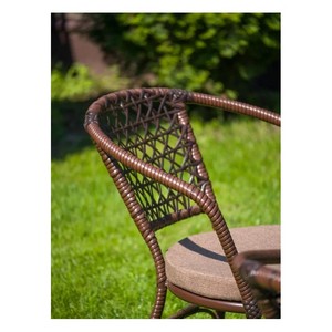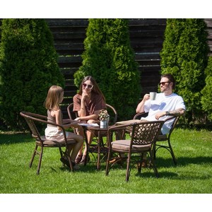 Изящная оплетка спинки, подлокотников и ножек из искусственного ротанга придает стулу изысканный вид и приятную на ощупь текстуру.