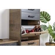 Обувница выполнена в теплом древесном оттенке дуб гранж песочный в сочетании с фасадом в цвете интра и черных металлических опор.