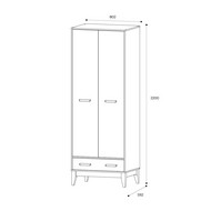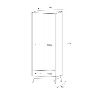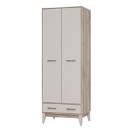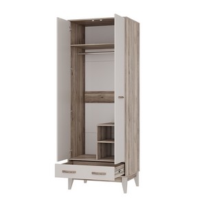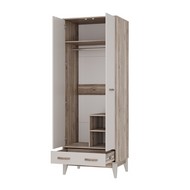 Шкаф двухстворчатый Скандика ШК-04 состоит из нижнего выкатного ящика, двух распашных дверок, за которыми находится отделение с хромированной штангой, вместительная верхняя полка и встроенный блок с двумя дополнительными полками.