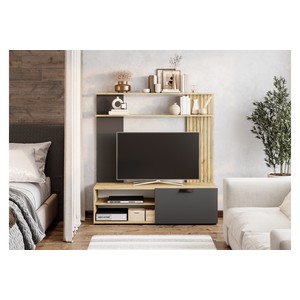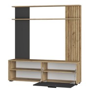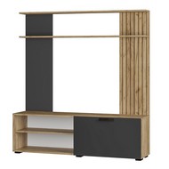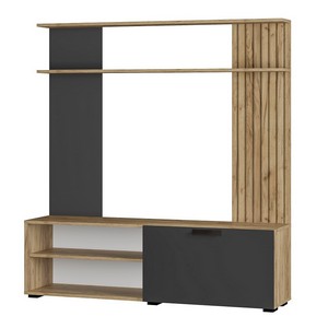 Стенка с полкой под ТВ 1 ГС-05 состоит из тумбы под ТВ с открытыми полками и шкафчиком с глухим откидным фасадом и двух навесных полок.