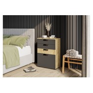 Гостиная Мишель комплект 1 - выполнена из высококачественного ЛДСП в цвете крафт с фасадами в глубоком оттенке графит и фотопечатью, имитирующей деревянные рейки.