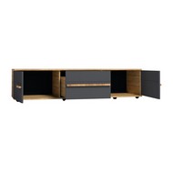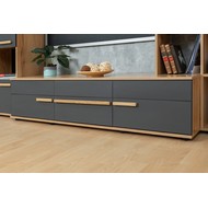Комплект состоит из длинной тумбы для ТВ, двух навесных полок и шкафа с открытыми полками.