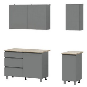 Нижний ряд состоит из модуля под мойку, модуля с выкатными ящиками и глухого шкафа.