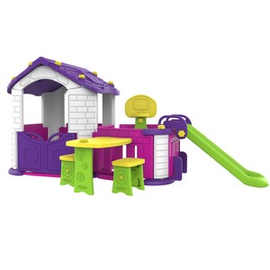 Домик с забором, столиком, стульчиками, баскетбольным кольцом и горкой.