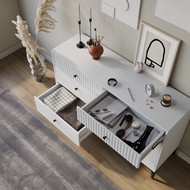 Комод MOON КМ-3.1 оснащен шестью вместительными выдвижными ящиками, что обеспечивает удобное разделение пространства для хранения различных категорий вещей.