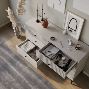 Комод MOON КМ-3.1 оснащен шестью вместительными выдвижными ящиками, что обеспечивает удобное разделение пространства для хранения различных категорий вещей.