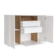 Комод включает два боковых отсека с дверцами, а по центру - открытую нишу, два выдвижных ящика и отсек с откидной дверцей.