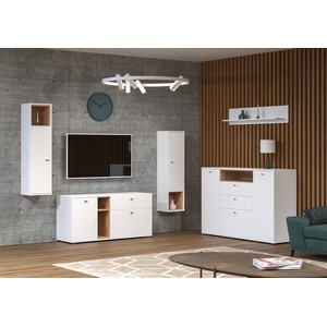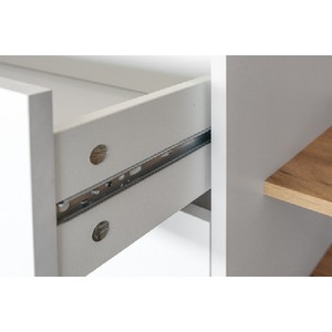 Корпус и фасады комода выполнены в цвете белый премиум, а открытая ниша и внутренние две стенки - в оттенке дуб крафт золотой.