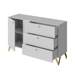 Комод объединяет три выдвижных ящика и одну распашную дверцу, за которой скрывается удобное внутреннее пространство с полками.