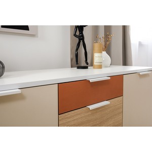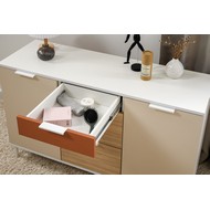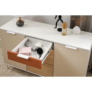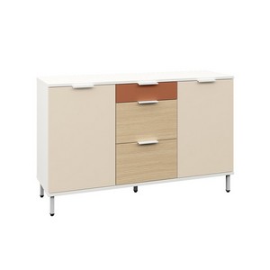 Комод Марвэл 16.234.02 выполнен в стильном сочетании белого корпуса с яркими фасадами в цвете сатин, плэйн и безмолвная пустыня.