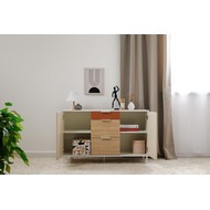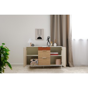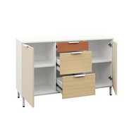 Комод состоит из трех выдвижных ящиков и двух боковых отсеков с распашными дверцами и полками.