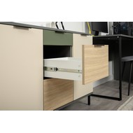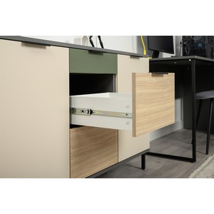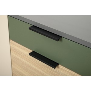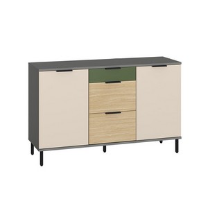Комод Марвэл 16.234.02 выполнен в стильном сочетании темно-серого корпуса с яркими фасадами в цвете сатин, плэйн и дымчатый зеленый.
