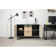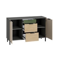 Комод состоит из трех выдвижных ящиков и двух боковых отсеков с распашными дверцами и полками.