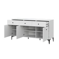 Комод MOON КМ-2.1 оснащен тремя вместительными выдвижными ящиками и тремя распашными дверцами, что обеспечивает удобное разделение пространства для хранения различных категорий вещей.
