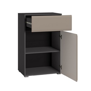 Комод состоит из верхнего выдвижного ящика и нижнего отсека с полкой за распашной дверцей.
