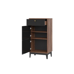 Две элегантные распашные дверцы скрывают просторное внутреннее пространство c полками и один выдвижной ящик с механизмом полного выдвижения.