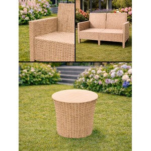 Стильный и практичный комплект из двух кресел, двухместного дивана и кофейного столика с эффектным плетением под ротанг, созданный для комфортного отдыха в саду, на террасе или у бассейна.
