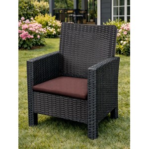 Стильный и практичный комплект из двух кресел, двухместного дивана и кофейного столика с эффектным плетением под ротанг, созданный для комфортного отдыха в саду, на террасе или у бассейна.