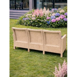 Комплект 2 садовых кресла, трехместный диван и столик под ротанг СадКо подарит вам комфортный отдых на свежем воздухе, объединяя стильный дизайн, практичность и надежность.
