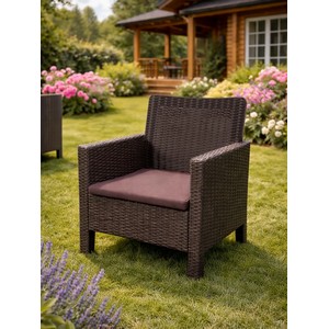 Комплект 2 садовых кресла, трехместный диван и столик под ротанг СадКо (темно-коричневый с коричневыми подушками).