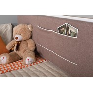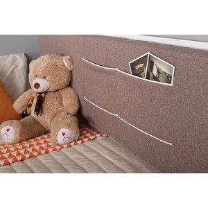 Спинка кровати обтянута приятной на ощупь тканью Savana Latte с карманами.