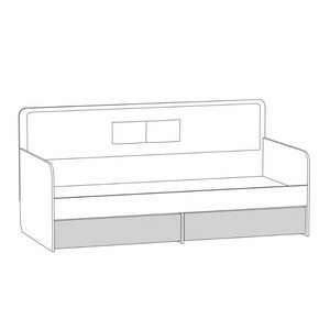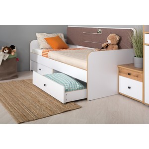 Кровать оснащена двумя выдвижными ящиками на колесных опорах с черными ручками-кнопками.
