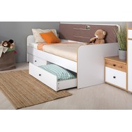 Детская кровать Вуди 11.02 выполнена в белом цвете с контрастной кромкой дуб золотой.