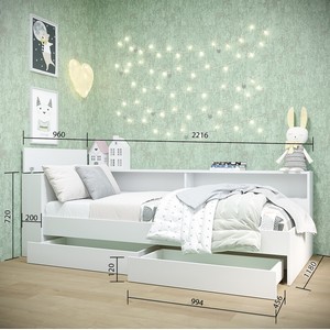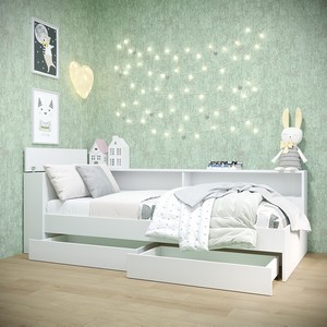 Кровать Ксения 90х200 с ящиками и прикроватным блоком (белый) - идеальное решение для детской спальни. Комплектуется головным блоком с откидной дверцей для хранения мелочей и прикроватным блоком с дополнительными полками.