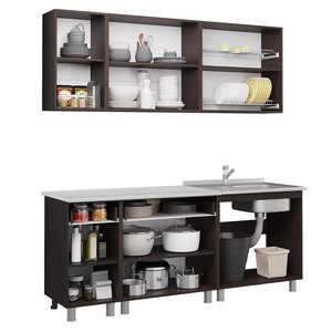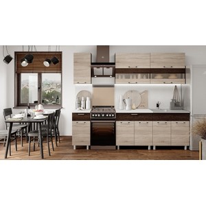 В комплект входят верх: шкафы 4В1, 8В3, 8В3, низ: 4Р5 рабочий на 400 с 1 выдвижным ящиком и 1 распашной своркой, 8Р5рабочий на 800, с 1 выдвижным ящиком и 2 распашными створками, 8М2 мойка на 800, фальш панель и 2 распашные створки.