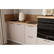Цельная столешница без видимых стыков для простоты ухода, сменные металлические ручки, не требующие пересверливания.